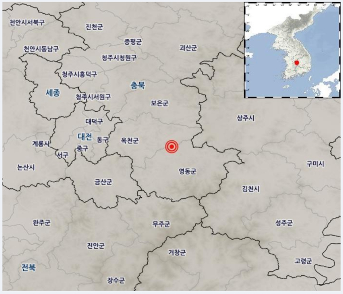 지진의 진앙은 충북 옥천군 동쪽 17km 지역이며, 진앙의 상세 주소는 충북 옥천군 청성면 조천리, 진원의 깊이는 9km로 분석됐다.